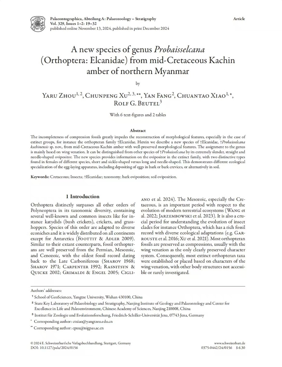 太阳成tyc33455ccwww地质学专业硕士研究生周雅茹在肖传桃教授、南京地质古生物研究所的许春鹏博士的共同指导下,在地球科学与古生物学领域期刊《PalaeontographicaAbteilungA》上发表题为“Anew species of genusProbaisselcana (Orthoptera:Elcanidae) from mid-Cretaceous Kachin amber of northern Myanmar”的研究论文。