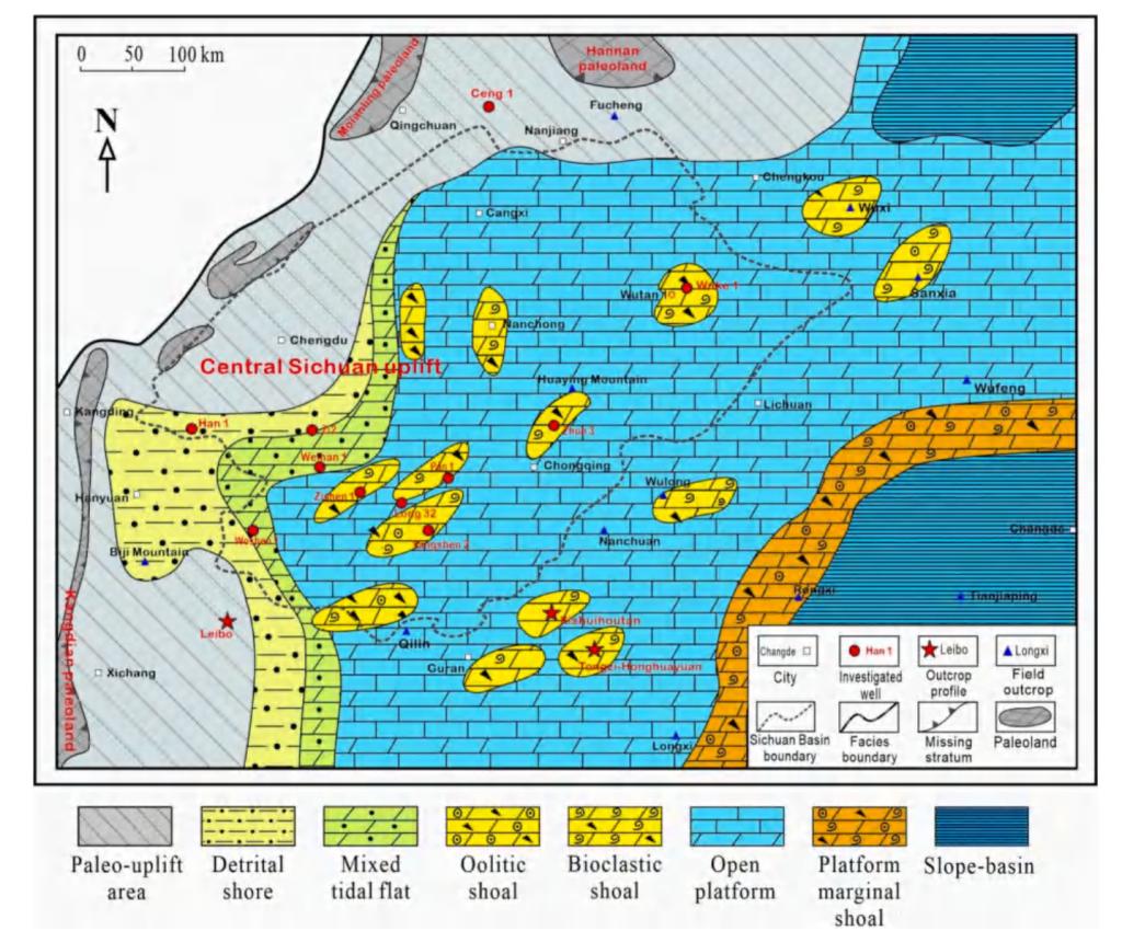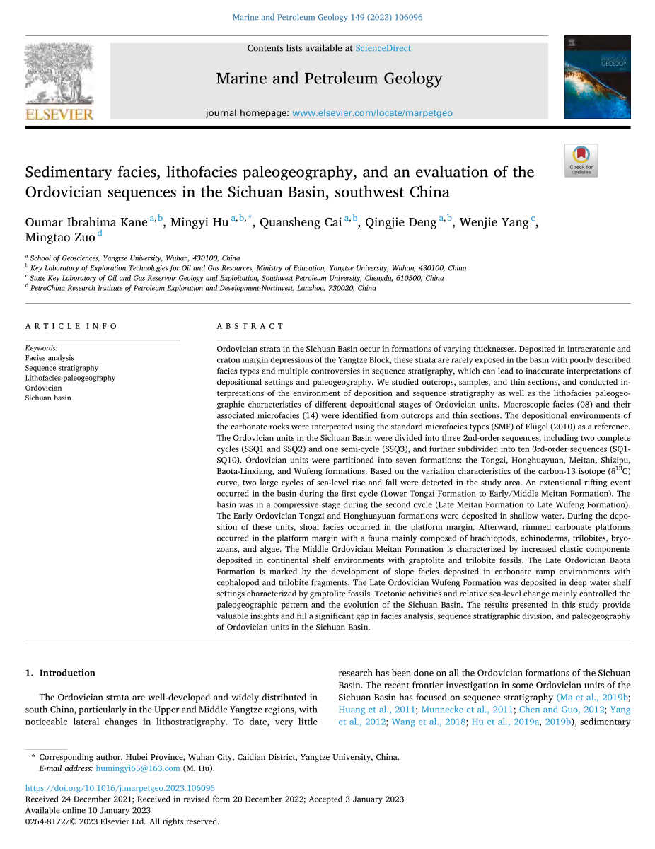 太阳成tyc33455ccwww胡明毅教授团队在石油地质领域主流期刊《Marine and Petroleum Geology》发表了题为“Sedimentary facies, lithofacies paleogeography, and an evaluation of theOrdovician sequences in the Sichuan Basin, southwest China”的研究论文。论文基于露头、岩心、薄片观察,结合碳氧同位素等测试分析对中国西南部地区四川盆地奥陶系层序地层、沉积体系和岩相古地理开展了研究,将四川盆地奥陶系划分为3个二级层序、10个三级层序(图1),系统编制了该区奥陶系岩相古地理图(图1),建立了该区奥陶系沉积演化模式,认为该区早奥陶世发育镶边台地、晚奥陶世发育缓坡台地沉积。