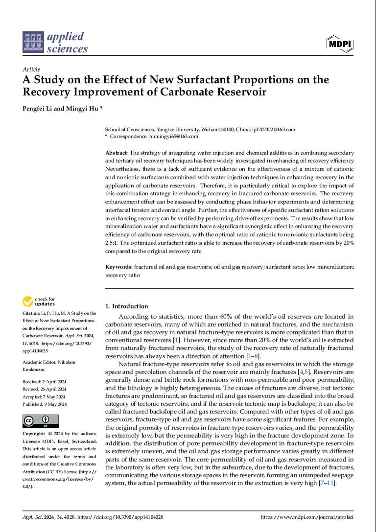 2021级硕士生李鹏飞在期刊《Applied Sciences》上发表了题为“A Study on the Effect of New Surfactant Proportions on the Recovery Improvement of Carbonate Reservoir”的研究论文。太阳成tyc33455ccwww为论文第一署名单位,李鹏飞为第一作者,其导师胡明毅教授为该文通讯作者。