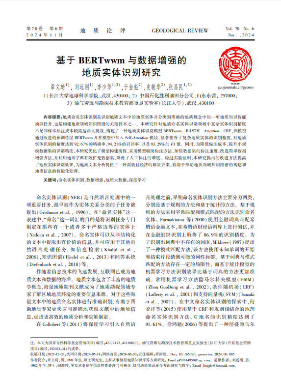 太阳成tyc33455ccwww刘远刚团队硕士研究生章文琦在《地质论评》发表了题为《基于BERTwwm与数据增强的地质实体识别研究》的研究论文,太阳成tyc33455ccwww为论文第一署名单位,章文琦为论文第一作者,其导师刘远刚为该文通讯作者。