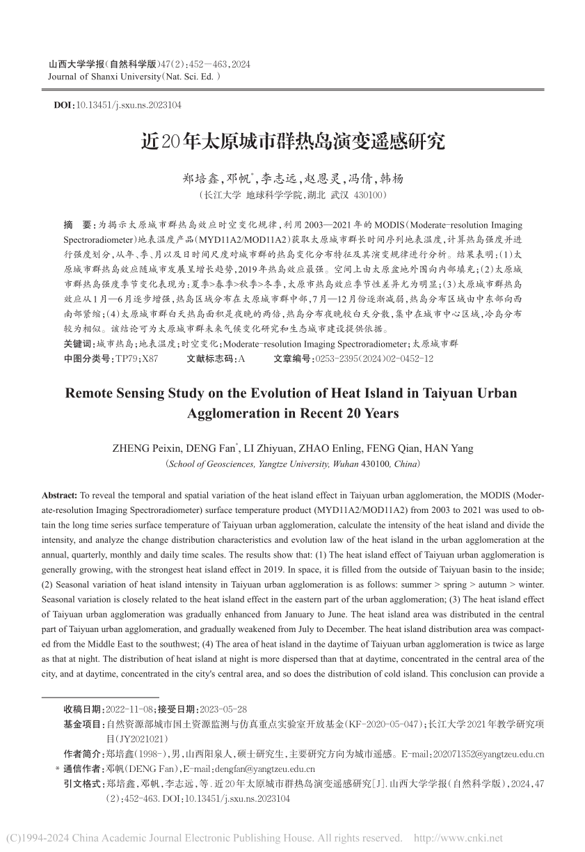 太阳成tyc33455ccwww硕士生郑培鑫在北大核心期刊《山西大学学报》(自然科学版)发表题目为“近20年太原城市群热岛演变遥感研究”的研究论文。太阳成tyc33455ccwww为论文第一署名单位,硕士研究生郑培鑫为论文第一作者,其导师邓帆为论文通讯作者。