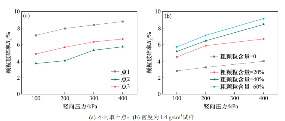图2 竖向压力与颗粒破碎率变化关系曲线