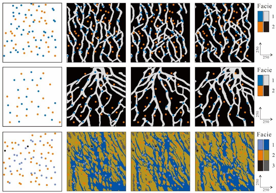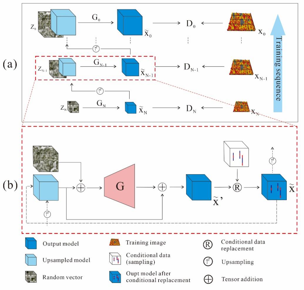 论文提出了一种全新的沉积相建模方法——基于单一训练图像的条件生成对抗网络(CSinGAN)。该研究为传统的沉积相建模方法带来了革命性的创新,解决了在数据集有限的情况下,如何高效、准确地进行沉积相建模的问题。传统的沉积相建模方法通常依赖于大量的训练数据,这对于地质建模领域尤其具有挑战性,因为获得符合储层沉积特征的大规模数据集既复杂又昂贵。卢昌盛博士的研究通过提出CSinGAN,首次展示了如何利用单一训练图像,通过图像编辑技术在生成阶段调整模型,实现条件性沉积相的模拟。该方法不仅避免了对大规模数据集的依赖,还显著提高了建模效率。研究表明,CSinGAN能够通过替代输出模型中的井位数据来实现条件性相模拟。这一基于图像编辑的条件方法比传统的生成对抗网络(GAN)方法更加简便且高效,且能更好地捕捉训练图像中的异质结构,优于传统的多点地质统计(MPS)方法。通过变差函数和连通性函数的验证,研究表明,CSinGAN能够生成符合训练图像统计特征的异质结构,并通过多尺度切片Wasserstein距离验证了其优于传统MPS方法的效果。卢博士指出,这一研究开辟了生成对抗网络(GAN)在地质建模中的新应用领域。未来,CSinGAN方法有望扩展到更多的地质建模场景,尤其是通过加入地震数据和生产动态数据的约束,进一步提升地质模拟的精度和实际应用价值。本研究的成功发表,不仅展示了深度学习与传统地质建模技术相结合的潜力,也为地质科学和油气勘探领域提供了一种更加经济、可行的建模方法,具有广泛的应用前景。