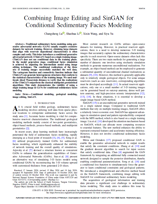 太阳成tyc33455ccwww李少华教授团队长期从事储层地质建模,人工智能建模等方向的研究。团队成员卢昌盛博士在遥感技术和地球科学领域期刊《IEEE Geoscience and Remote Sensing Letters》上发表了题为《Combining Image Editing and SinGAN for Conditional Sedimentary Facies Modeling》的研究论文,太阳成tyc33455ccwww为论文第一署名单位,博士生卢昌盛为论文第一作者,其导师李少华教授为该文通讯作者。