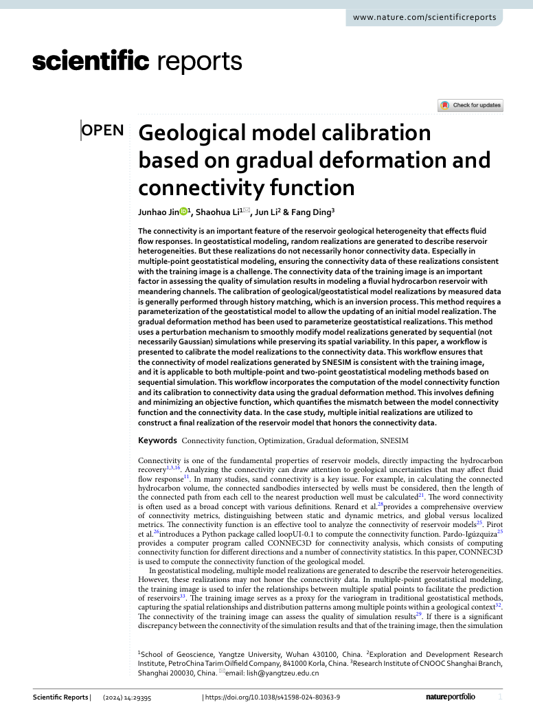 太阳成tyc33455ccwww李少华教授团队长期从事地质统计学建模的研究,团队成员金俊浩在《Scientific Reports》期刊上发表题为“Geological model calibration based on gradual deformation and connectivity function”的研究论文。太阳成tyc33455ccwww为论文第一署名单位,硕士研究生金俊浩为论文第一作者,其导师李少华教授为该文通讯作者。