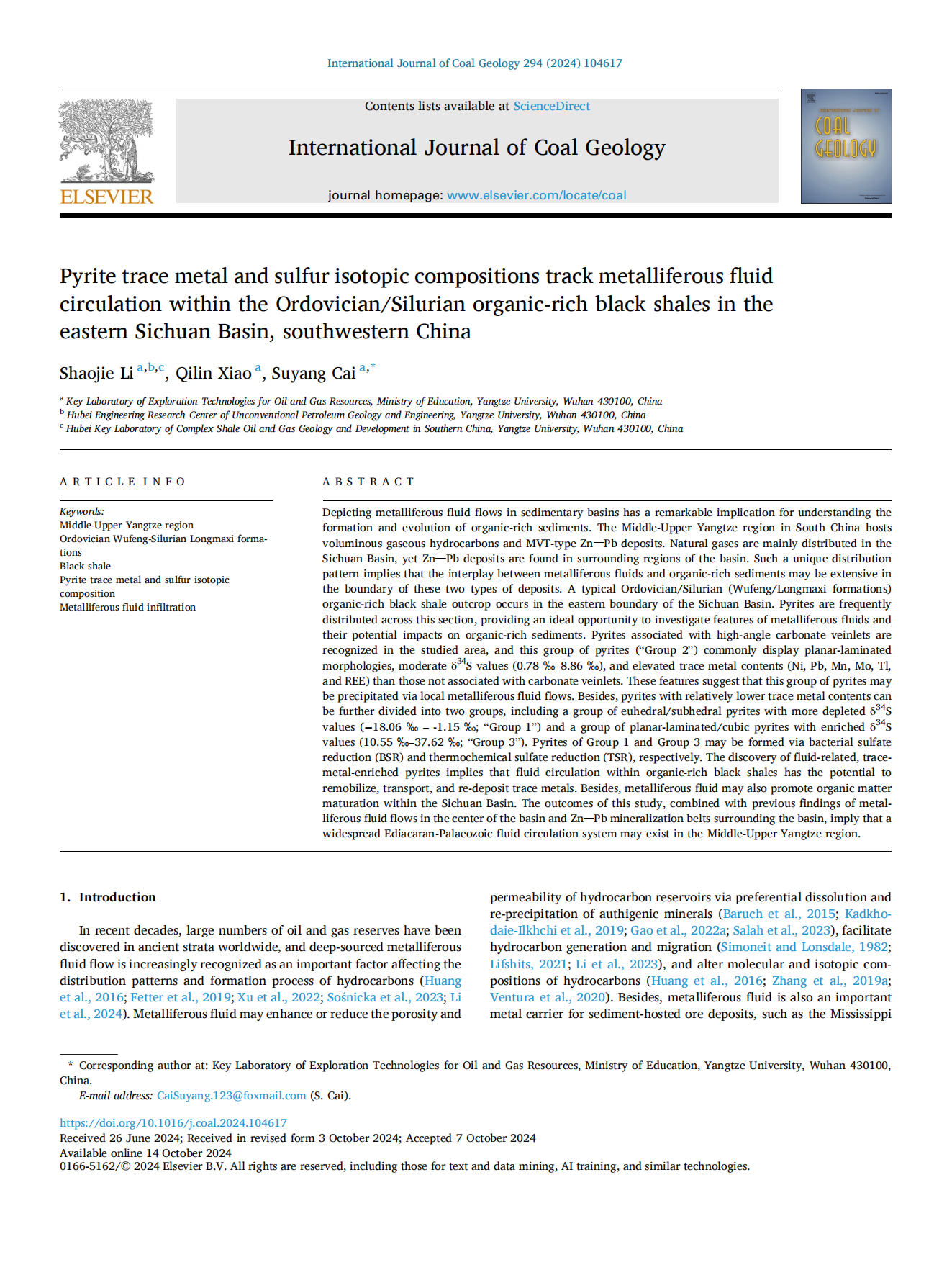 太阳成tyc33455ccwww石油系李劭杰在煤田地质学领域主流国际SCI期刊《International Journal of Coal Geology》上发表题为“Pyrite trace metal and sulfur isotopic compositions track metalliferous fluid circulation within the Ordovician/Silurian organic-rich black shales in the eastern Sichuan Basin, southwestern China”的研究论文。