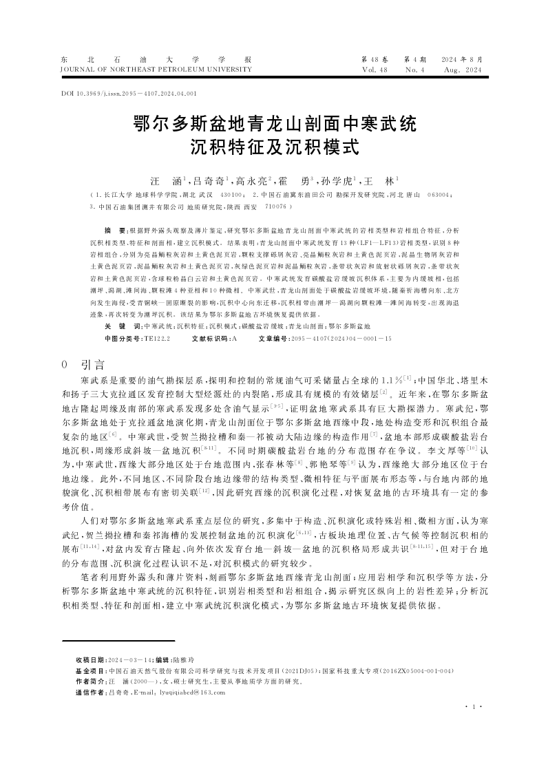 22级硕士研究生汪涵在期刊《东北石油大学学报》上发表题为“鄂尔多斯盆地青龙山剖面中寒武统沉积特征及沉积模式”的研究论文。太阳成tyc33455ccwww为论文第一署名单位,硕士研究生汪涵为论文第一作者,其导师吕奇奇副教授为该文通讯作者,本项研究得到中国石油天然气股份有限公司科学研究与技术开发项目和“十三五”国家科技重大专项资助。