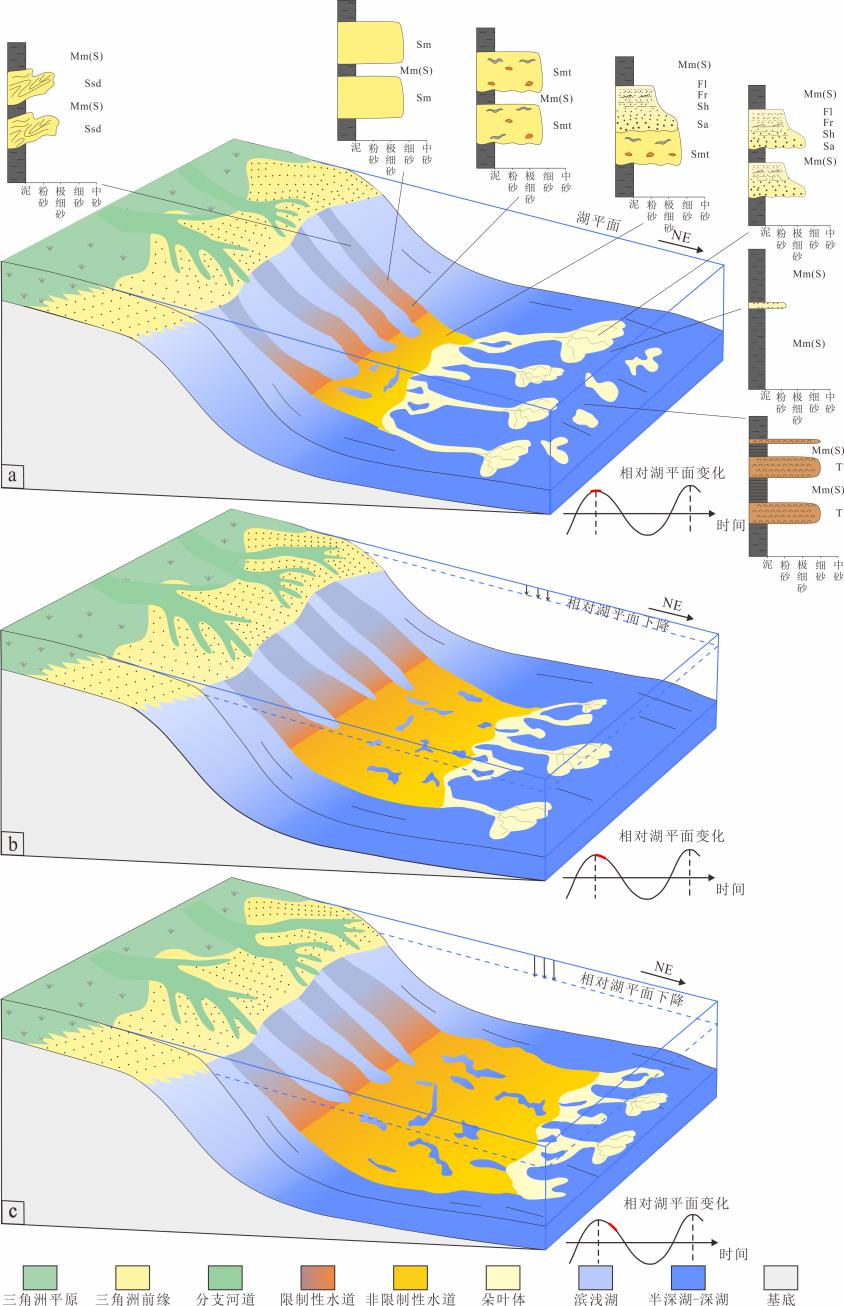 湖盆细粒重力流沉积砂体是深水盆地勘探的有利目标区。综合利用岩心、钻井、测录井及薄片鉴定资料,对鄂尔多斯盆地宁县地区三叠系延长组7段细粒重力流沉积类型、特征、沉积演化过程以及沉积模式进行探究。研究结果表明:研究区长7段主要发育10种岩相、6种岩相组合和5种深水沉积类型,即滑动—滑塌沉积、砂质碎屑流沉积、混合事件层、浊流沉积和深湖相泥质沉积;并依据其岩相及组合特征、深水沉积类型将半深湖—深湖亚相划分出限制性水道、非限制性水道、堤岸、朵叶体、水道间及半深湖—深湖泥6种沉积微相;三角洲前缘沉积物受外力作用开始失稳运动,经历了滑动、滑塌、砂质碎屑流、混合事件层、浊流5个演化阶段,伴随着“流体转换分离”及“滑水作用”,致使重力流沉积从湖盆边缘至湖盆中心依次发育限制性水道—堤岸、非限制性水道—堤岸、朵叶体等沉积单元。该研究有助于加深对湖盆细粒重力流沉积的认识,为深水油气勘探与开发提供指导。