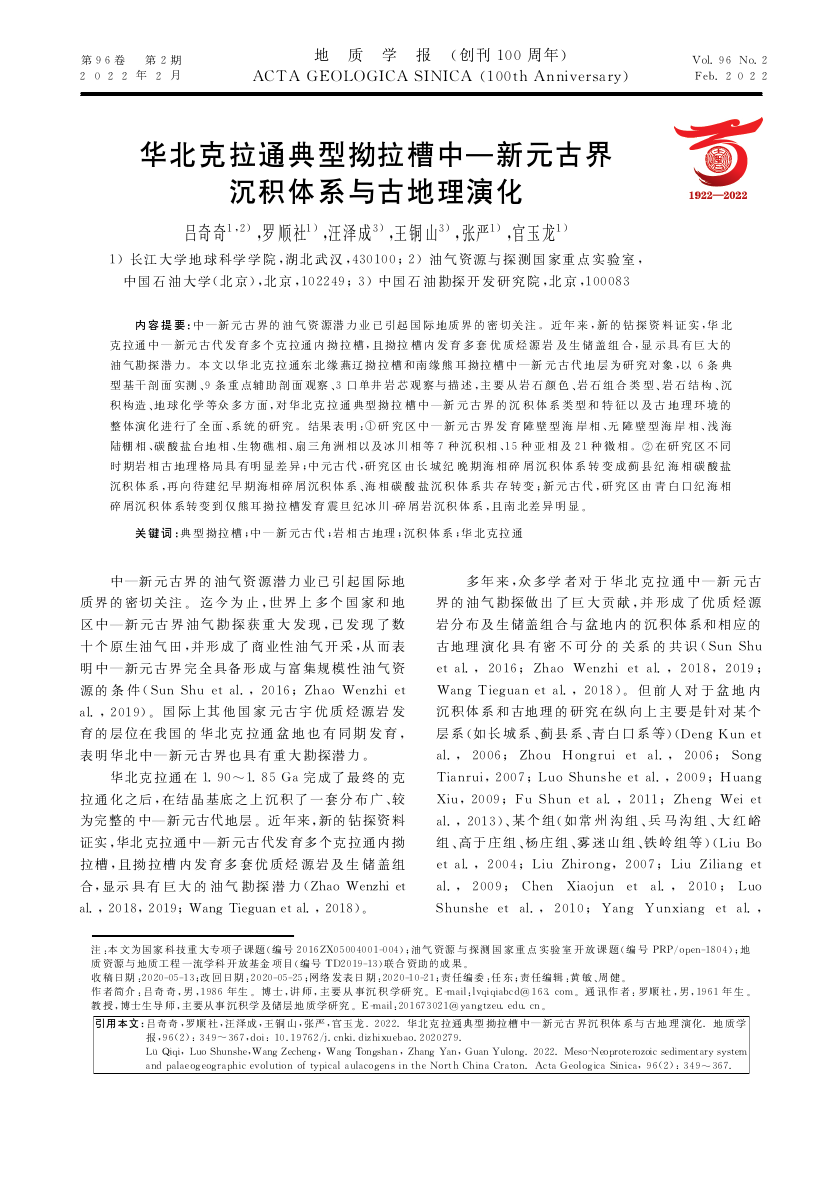 太阳成tyc33455ccwww教师吕奇奇副教授以第一作者身份在石油领域重要期刊《地质学报》发表题为《华北克拉通典型拗拉槽中—新元古界沉积体系与古地理演化》的研究论文,该项研究得到了国家科技重大专项子课题、油气资源与探测国家重点实验室开放课题和地质资源与地质工程一流学科开放基金项目的资助。