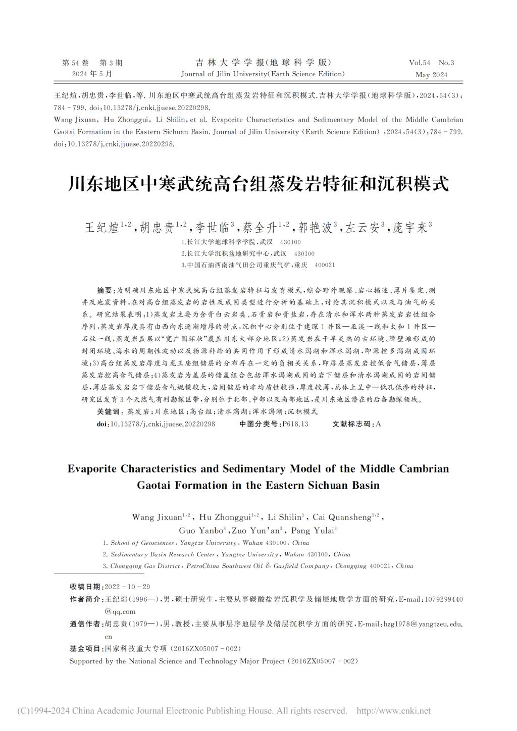 20级硕士研究生王纪煊在期刊《吉林大学学报(地球科学版)》上发表题为“川东地区中寒武统高台组蒸发岩特征和沉积模式”的研究论文。太阳成tyc33455ccwww为论文第一署名单位,硕士研究生王纪煊为论文第一作者,其导师胡忠贵教授为该文通讯作者。