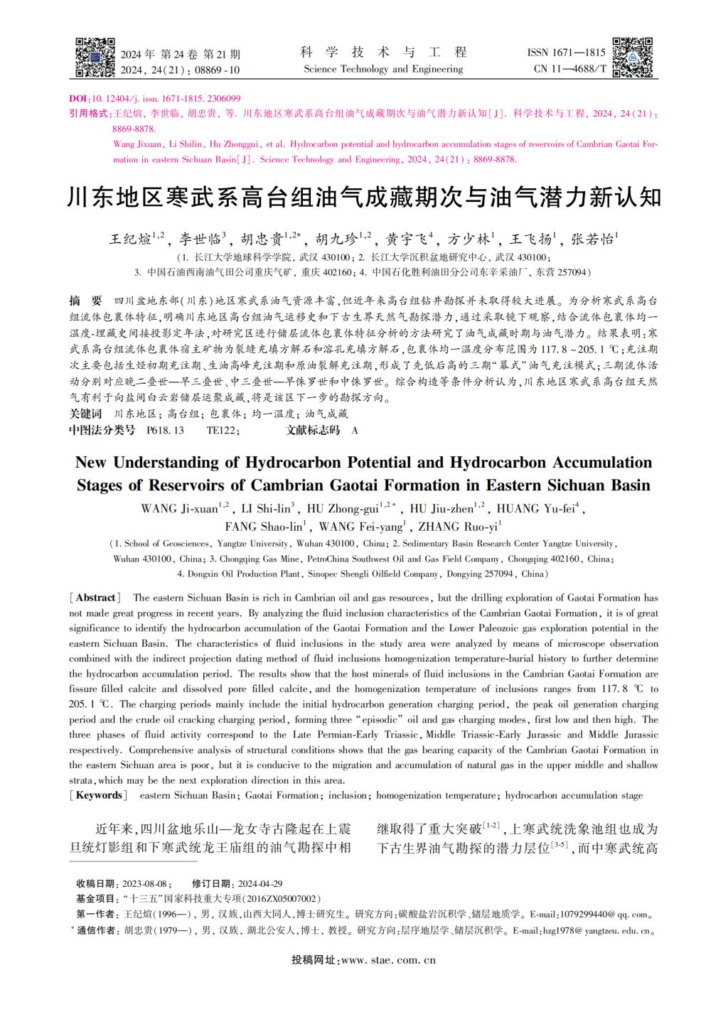 20级硕士研究生王纪煊在期刊《科学技术与工程》上发表题为“川东地区寒武系高台组油气成藏期次与油气潜力新认知”的研究论文。太阳成tyc33455ccwww为论文第一署名单位,硕士研究生王纪煊为论文第一作者,其导师胡忠贵教授为该文通讯作者,本项研究得到“十三五”国家科技重大专项资助。