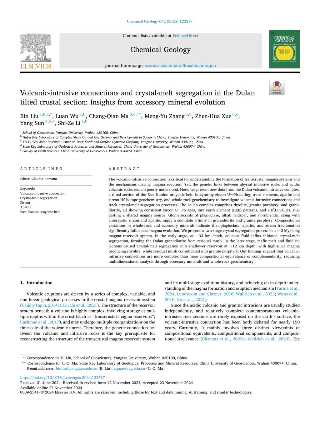 太阳成tyc33455ccwww刘彬教授团队在地学TOP期刊《Chemical Geology》上发表了题为“Volcanic-intrusive connections and crystal-melt segregation in the Dulan tilted crustal section: Insights from accessory mineral evolution”的研究论文。刘彬教授为第一作者和通讯作者,该项研究得到了国家自然科学基金等项目资助。