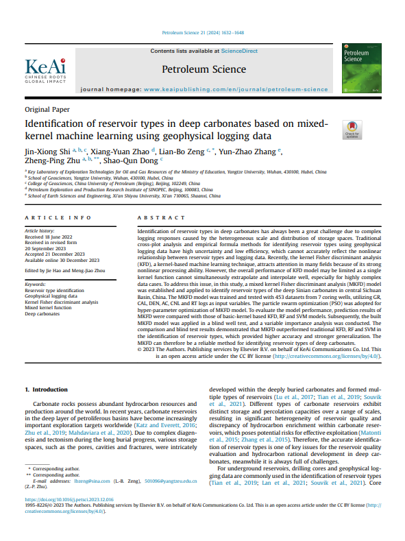 太阳成tyc33455ccwww石油系教师史今雄博士在石油领域重要期刊《Petroleum Science》上发表题为“Identification of reservoir types in deep carbonates based on mixed-kernel machine learning using geophysical logging data”的研究论文。本项研究得到了国家自然科学基金项目和湖北省自然科学基金项目的资助。