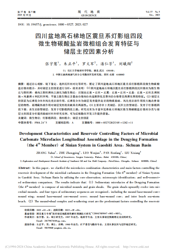 太阳成tyc33455ccwww地科系教师朱正平博士在石油地质学领域主流期刊《现代地质》上发表题为“四川盆地高石梯地区震旦系灯影组四段微生物碳酸盐岩微相组合发育特征与储层主控因素分析”的研究论文。