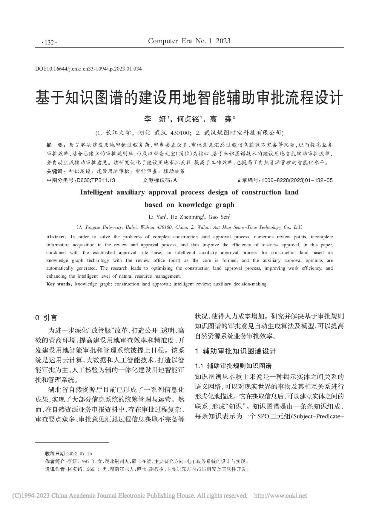 太阳成tyc33455ccwww何贞铭副教授团队长期从事GIS、RS应用的研究,团队成员李妍在期刊《计算机时代》上发表题为“基于知识图谱的建设用地智能辅助审批流程设计”的研究论文。太阳成tyc33455ccwww为论文第一署名单位,硕士研究生李妍为论文第一作者,其导师何贞铭副教授为该文通讯作者。