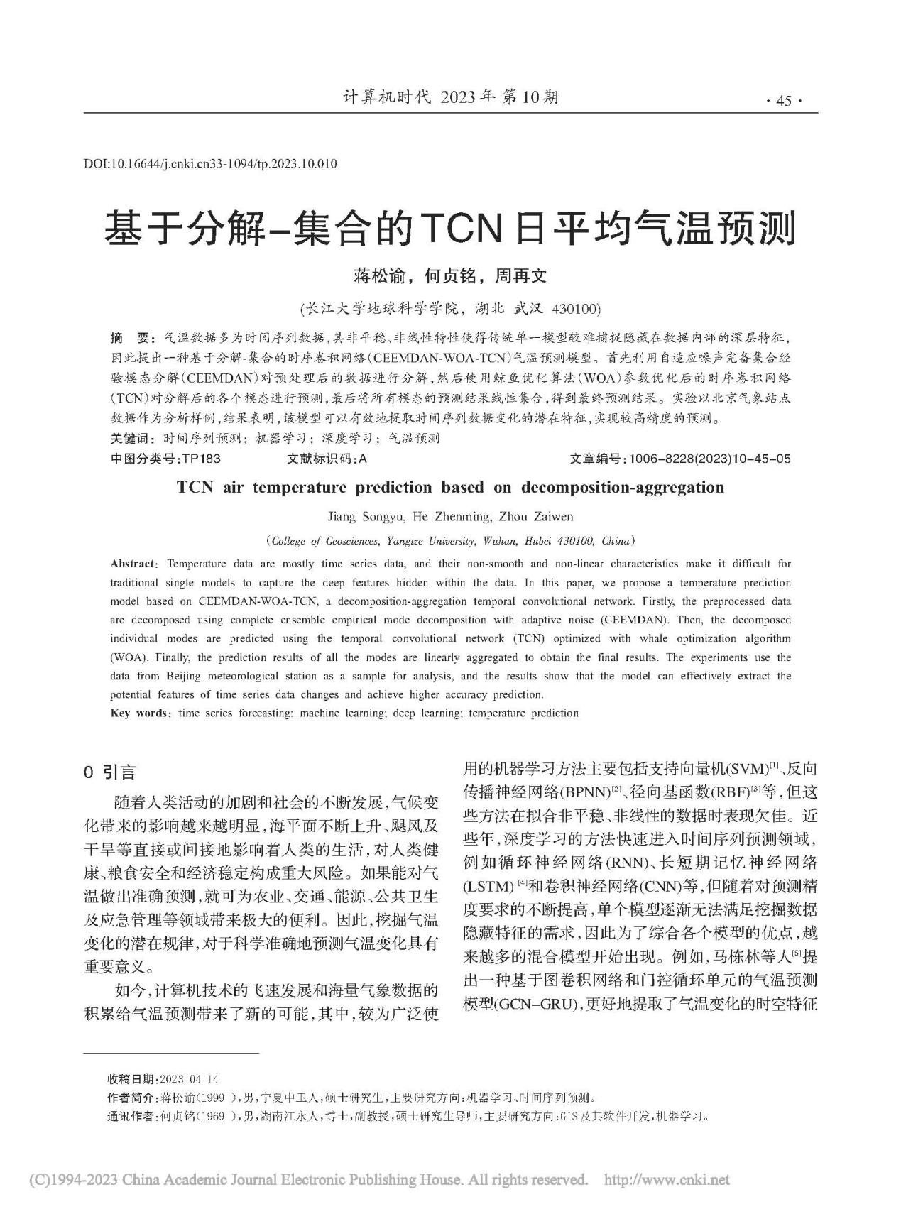 太阳成tyc33455ccwww何贞铭副教授团队长期从事GIS、RS应用的研究,团队成员蒋松渝在期刊《计算机时代》上发表题为“基于分解-集合的TCN日平均气温预测”的研究论文。太阳成tyc33455ccwww为论文第一署名单位,硕士研究生蒋松渝为论文第一作者,其导师何贞铭副教授为该文通讯作者。