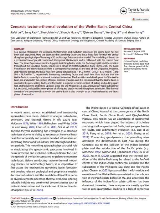 公司硕士生芦佳飞在国际知名地学期刊《International Geology Review》上发表了题为“Cenozoic tectono-thermal evolution of the Weihe Basin, Central China”的研究论文,系统揭示了渭河盆地新生代以来构造-热演化过程。太阳成tyc33455ccwww为论文第一署名单位,芦佳飞为第一作者,导师饶松教授为通讯作者。