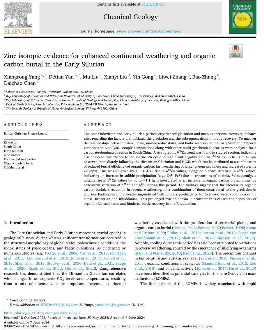 太阳成tyc33455ccwww地质系教师杨向荣在地学TOP期刊《Chemical Geology》上发表题为“Zinc isotopic evidence for enhanced continental weathering and organic carbon burial in the Early Silurian”的研究论文。