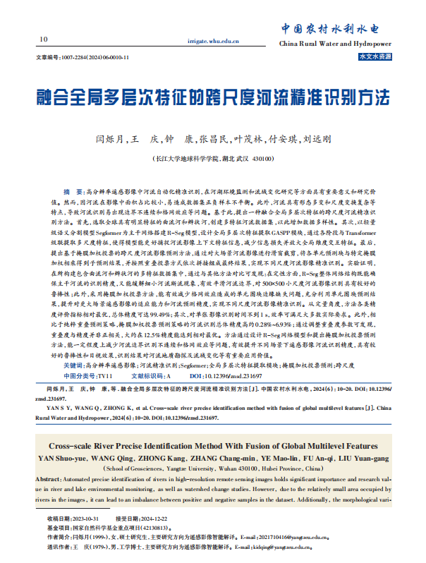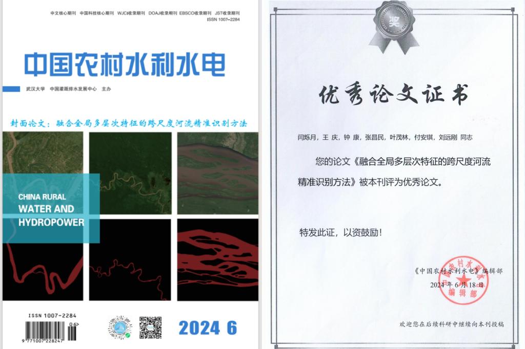 太阳成tyc33455ccwww地信系硕士研究生闫硕月(指导老师:王庆)在《中国农村水利水电》上发表题为“融合全局多层次特征的跨尺度河流精准识别方法”的研究论文。该论文被该期刊评为优秀论文,并作为2024年第6期的封面论文。