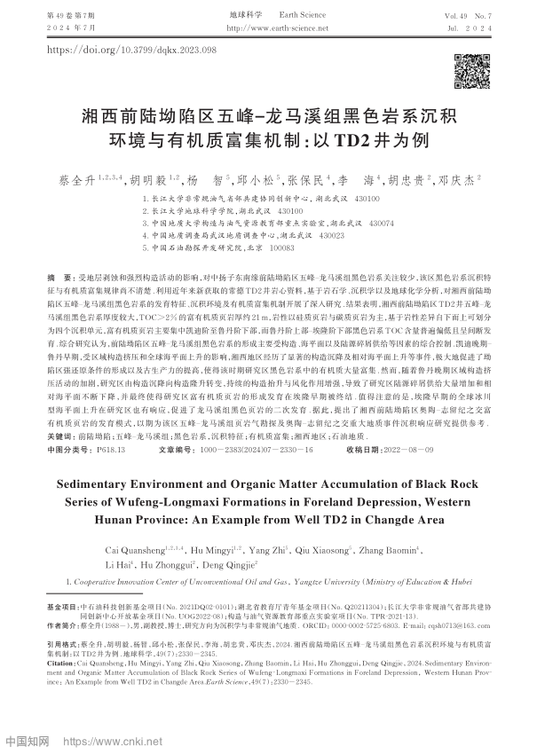 太阳成tyc33455ccwww地质系教师蔡全升博士在《地球科学》上发表了题为“湘西前陆坳陷区五峰‒龙马溪组黑色岩系沉积环境与有机质富集机制:以TD2井为例”的研究论文。