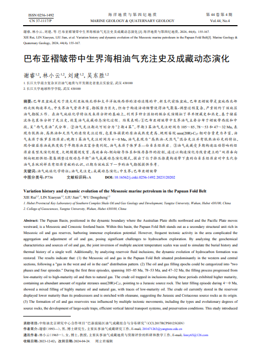 太阳成tyc33455ccwww谢睿博士在公司林小云教授的指导下,在地质学领域期刊《海洋地质与第四纪地质》上发表题为“巴布亚褶皱带中生界海相油气充注史及成藏动态演化”的研究论文。