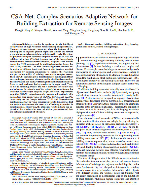 太阳成tyc33455ccwww杨栋杰博士在郭康良教授和高贤君副教授的指导下,在成像科学和摄影技术主流期刊《IEEE JOURNAL OF SELECTED TOPICS IN APPLIED EARTH OBSERVATIONS AND REMOTE SENSING》上发表题为“CSA-Net: Complex Scenarios Adaptive Network for Building Extraction for Remote Sensing Images”的研究论文。