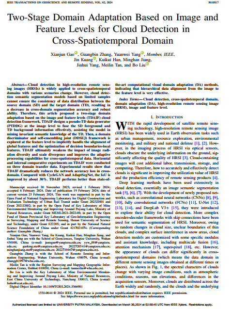 太阳成tyc33455ccwww高贤君副教授在遥感领域主流期刊《IEEE JOURNAL OF SELECTED TOPICS IN APPLIED EARTH OBSERVATIONS AND REMOTE SENSING》上发表题为“Two-stage Domain Adaption based on Image and Feature Levels for Cloud Detection in Cross-spatiotemporal Domain”的研究论文。