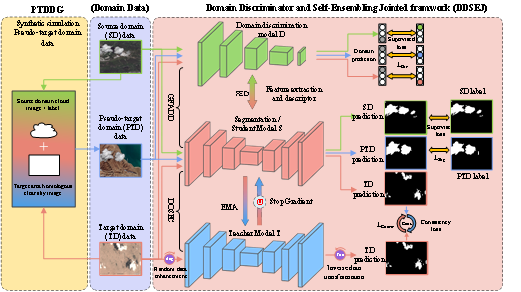 该研究主要针对有限样本的云检测语义分割模型无法保证源域(SD)和目标域(TD)之间数据分布的一致性,导致跨域分割精度和鲁棒性能力下降。因此,本文提出了一种基于图像和特征层的两阶段域自适应(TDAIF)云检测框架。TDAIF (图1)在图像层设计了一个伪目标域数据生成器(PTDDG),有效融合标清前景和标清背景信息,辅助模型挖掘标清的不变语义知识。然后,在特征层面探索了一个域判别和自组装联合(DDSEJ)框架,隐式地处理全局特征的对齐和决策边界-局部特征的优化。TDAIF 最终削弱了图像辐射多样性和尺度发散的影响,提高了跨时空数据的自适应处理能力。在三个域传输数据上对 TDAIF 进行了横向和内部对比实验。实验结果表明,TDAIF 显著降低了跨域网络精度损失。与 CycleGAN 和 AdaptSegNet 相比,IoU 提高了约 30%。TDAIF 的表现优于最先进的计算视域适应方法,这表明从图像到特征层的分层数据对齐非常有效(图2)。