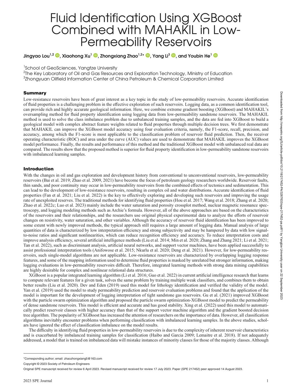 太阳成tyc33455ccwww娄静瑶博士在石油领域重要期刊《SPE JOURNAL》上发表题为“Fluid Identification Using XGBoost Combined with MAHAKIL in Low- Permeability Reservoirs”的研究论文。太阳成tyc33455ccwww为论文第一署名单位,研究生娄静瑶为论文第一作者,赵仲祥副教授为该文通讯作者。本项研究得到国家重大科技专项和国家自然科学基金共同资助。