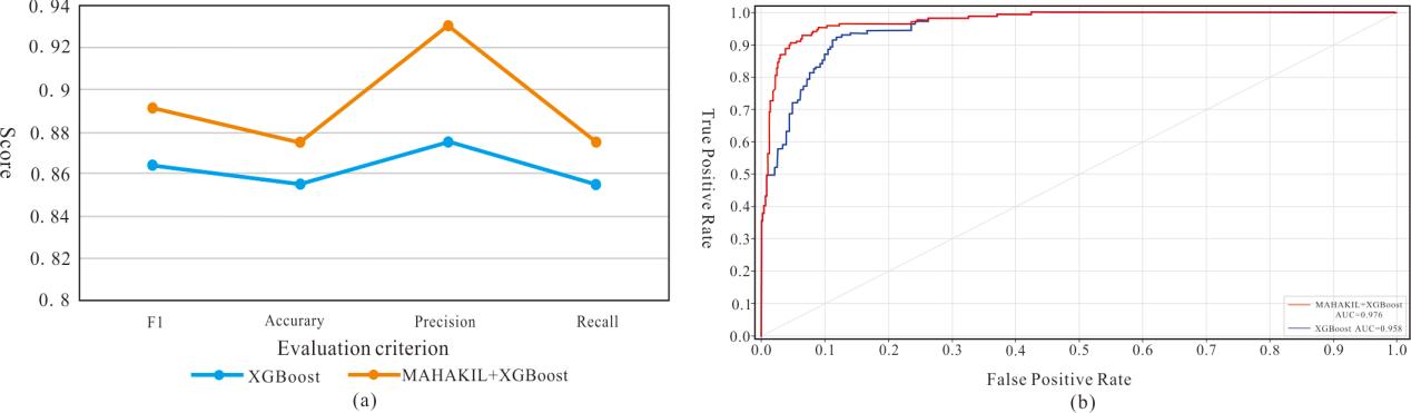 该研究选取中国松辽盆地古龙油田姚一段葡萄花组油层为验证对象,将XGBoost和MAHAKIL的过采样方法结合,利用低渗砂岩储层的测井数据进行流体性质识别(图1)。采用MAHAKIL方法解决训练样本不平衡导致类不平衡的问题,将数据输入XGBoost,通过多个决策树建立复杂测井曲线特征与流体性质相关响应权重的地质模型。首先,利用F1-Score、Recall、Precision和Accuracy四个评价标准证明经过MAHAKIL过采样后的XGBoost模型在流体识别方面表现优于未处理数据的XGBoost模型。在不平衡数据集的情况下,MAHAKIL提高了模型的识别精度,且F1-score更适用于储层流体预测的分类问题(图2a)。其次,用ROC和AUC的值证明了MAHAKIL提高了XGBoost的性能(图2b)。最后,将该方法和传统的XGBoost模型在类不平衡的实际数据上的应用结果和性能进行对比。结果表明,该方法在训练样本不平衡的情况下,对低渗砂岩储层的流体性质识别具有优越性(图3)。