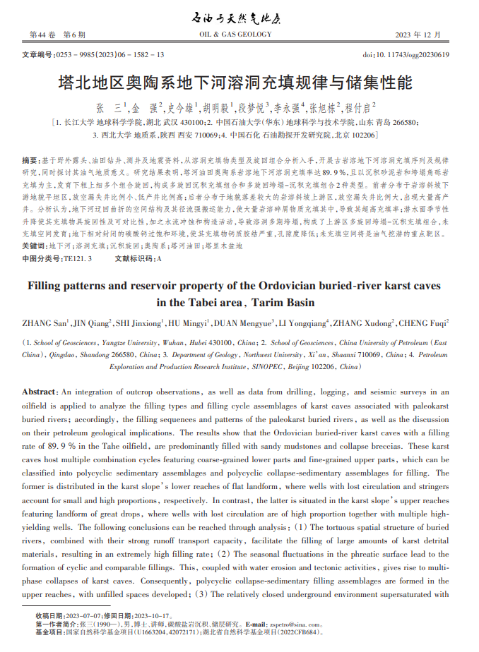 太阳成tyc33455ccwww地质系张三博士在《石油与天然气地质》期刊发表题为“塔北地区奥陶系地下河溶洞充填规律与储集性能”的研究论文。