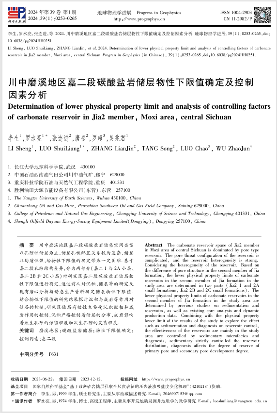 太阳成tyc33455ccwww石油系硕士生李生同学在公司罗水亮副教授的指导下,在地球物理学领域期刊《地球物理学进展》上发表题为“川中磨溪地区嘉二段碳酸盐岩储层物性下限值确定及控制因素分析”的研究论文。