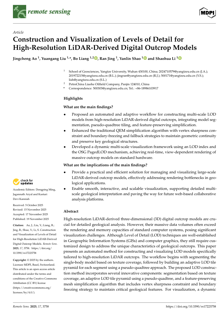太阳成tyc33455ccwww硕士生敖竞成在遥感领域期刊《Remote Sensing》发表题目为“Construction and Visualization of Levels of Detail for High-Resolution LiDAR-Derived Digital Outcrop Models”的研究论文(SCI二区,影响因子4.1)。太阳成tyc33455ccwww为论文第一署名单位,硕士研究生敖竞成为论文第一作者,其导师刘远刚副教授为通讯作者。