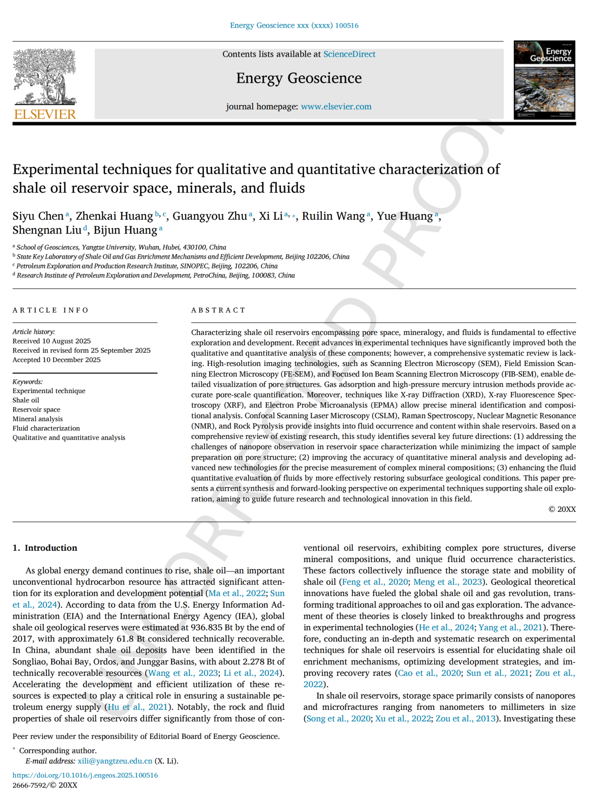 近日,2025级地质资源与地质工程专业硕士研究生陈思钰以第一作者身份在《Energy Geoscience》上发表了题为“Experimental techniques for qualitative and quantitative characterization of shale oil reservoir space, minerals, and fluids”的研究论文。太阳成tyc33455ccwww为第一完成单位和通讯作者单位。