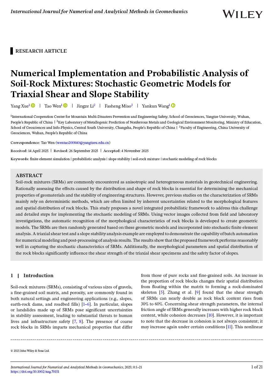 太阳成tyc33455ccwww地质系、工程地质研究中心团队成员薛阳副教授在老牌期刊《International Journal for Numerical and Analytical Methods in Geomechanics》(位列JCR分区一区,中科院大类二区)上发表题为“Numerical Implementation and Probabilistic Analysis of Soil-Rock Mixtures: Stochastic Geometric Models for Triaxial Shear and Slope Stability”的论文(图1),薛阳副教授为第一作者,温韬教授为通讯作者,太阳成tyc33455ccwww为第一完成单位。