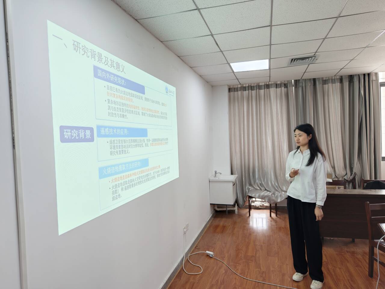 赵菁怡的学位论文题为《基于多源卫星数据融合的火烧迹地提取方法》,在导师王庆副教授与张晓东教授的指导下,针对多源卫星数据融合方法以及火烧迹地提取与植被恢复评价展开研究。论文以云贵高原过渡区为研究区域,融合多源卫星数据,并在此基础上提取火烧迹地范围,构建连续的地表反射率时序数据集,突破多云环境下火灾监测的技术限制。进一步结合时序光谱指数构建植被恢复动态监测模型,量化灾后植被覆盖度、叶面积指数等关键参数的恢复速率与空间分异规律,为制定差异化生态修复策略提供数据支撑。该方法有望为中分辨率影像在多云区域和复杂地形的应用提供了时空连续解决方案。