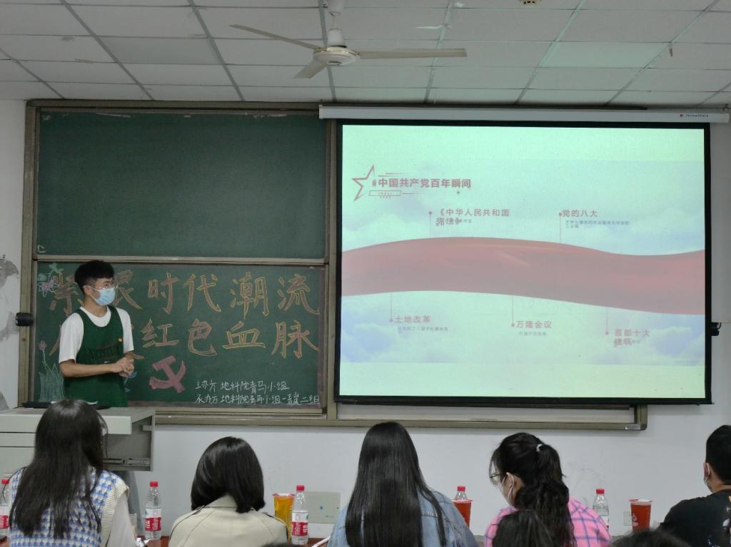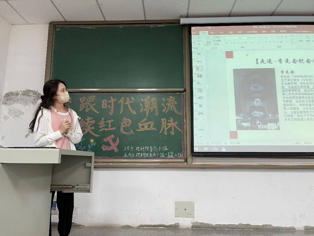 首先,在主持人杜子萱清脆响亮的声音宣布下,“青岚”一组的同学按顺序依次上台进行答辩。随着PPT一页一页地放映,一幕幕感人至深的场景被同学们用绘声绘色的语言演绎出来,一个又一个党史小故事被讲述,一项又一项实践的过程被分享。每位同学讲述中突出的关键词都有所不同,他们任选“理想创引、核心创立、宗旨创设、理论创新、制度创建、精神创铸、改革创举、复兴创业、统战创同、天下创和、军队创强、党建创先”中的两至三个进行研学,讲解的内容深刻丰富,在场的同学听得津津有味。