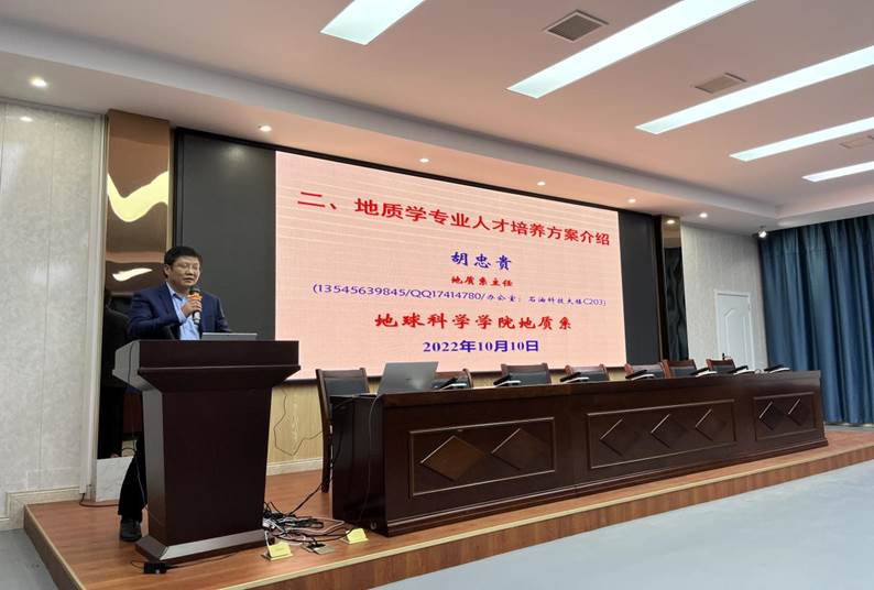 胡忠贵主任从公司和地质学的办学历史、团队力量、实践平台、人才培养等方面做了详细介绍。从通识课程、主要专业课程、专业实习实践等方面需要达到的要求给同学们详细介绍了地质学专业的人才培养方案。