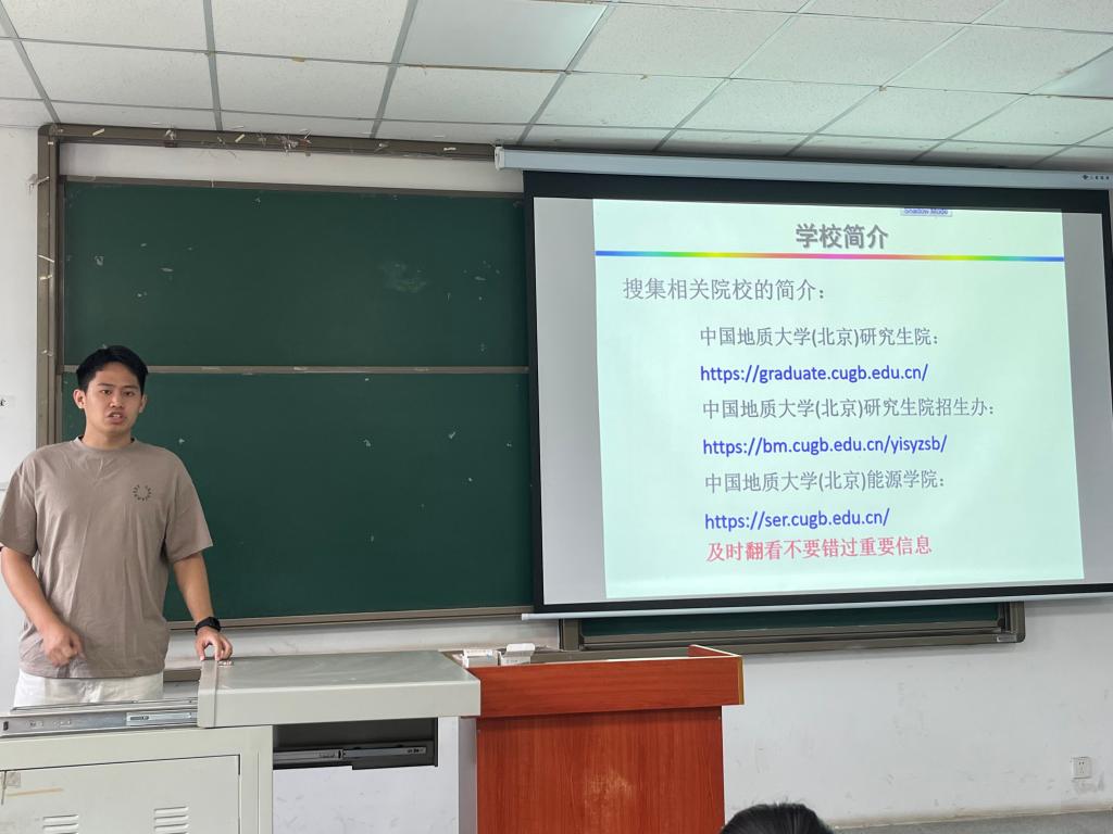 地信(测绘)21902班的李桥和贾俊红两位同学为大家带来不少干货。李桥说“在复习考研英语的过程中,要坚持每天背单词,词汇量的多少是决定考研英语分数高低的最主要因素”,他还分享了自己的调剂经验。贾俊红叮嘱大家在紧张的复习的过程中也别忘了劳逸结合,适当放松也可以达到事半功倍的效果。通过他们的分享,同学们更加明确了考研备战计划和目标,积极备考,朝着理想不断前行。