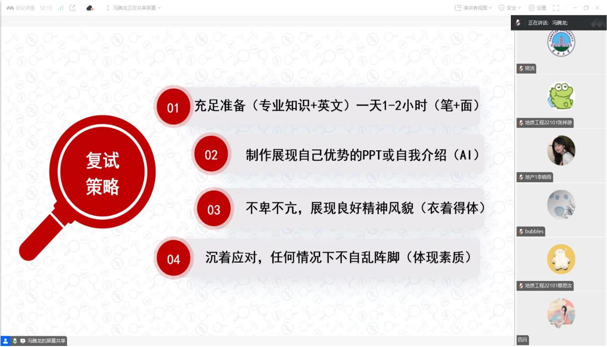 地信 22004 班的黄振兴以自己成功调剂录取到中南民族大学的亲身经历展开讲述。他感慨:“调剂并非考研的失败,反而是通往研究生之路的新起点。”他详细阐述了如何精准筛选合适的调剂院校,怎样与招生老师沟通,以及面对压力的心理调适方法;地信(产业)22001 班周思菡则以自己调剂录取云南大学为例,重点讲解了调剂信息搜集、联系导师、填报志愿等关键事件的时间节点,让同学们对调剂环节有了深入的认识;地信 22002 班符凡翕,主要介绍了复试简历的制作方法和细节问题;资工(石油之光)22001班王豪和地质(资源)22001 班的卢震,提醒同学们在复试中应注意语言表达、衣着打扮以及姿态礼仪,在复试结束后要及时跟进录取情况;资工(石油之光)22001 班冯腾龙分享了制作高质量中英文自我介绍的方法和模板,他强调:“合适的PPT展示能让导师更直观地了解自己的优势与成果,给面试官留下良好第一印象。”地信(产业)22001 班孔祥睿着重分享了在面试中清晰表达个人观点、巧妙应对突发问题的方法,以确保自己取得较好的分数。