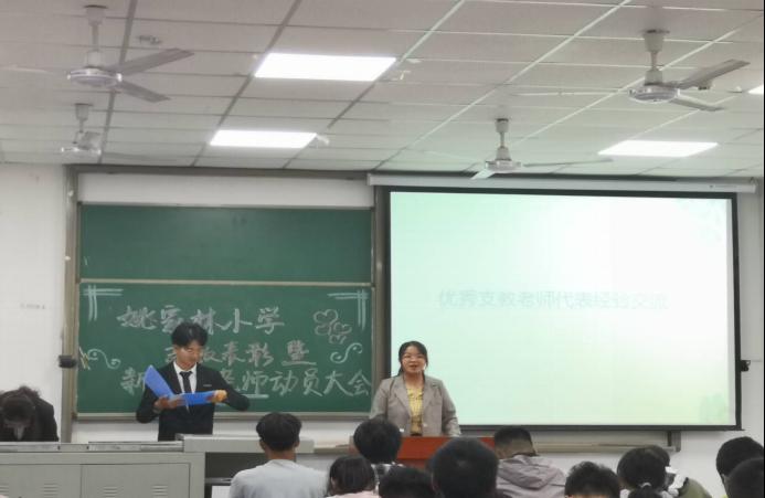 接着,是优秀支教老师颁奖典礼。其中,优秀支教老师代表邓婷发表获奖感言,并为姚家林小学的爱心支教活动发表看法。邓婷提到,我们的支教老师在支教环境恶劣、工作繁杂的情况下依旧认真对待,为孩子们带来温暖与知识!在不断帮助他人的过程中,也在不断自我完善!经过支教老师们付出的众多努力,支教志愿活动获得了众多成果与嘉奖。相信支教老师们都会坚守“奉献,友爱,互助,进步”的志愿精神,在今后的支教活动中更好地为姚家林小学的孩子们带去欢乐与温暖。
