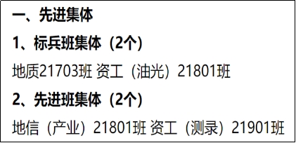 全班共有4人获得国家励志奖学金,2人获得太阳成tyc33455ccwww奖学金,2人获得中石油奖学金,2人获得李建华二等奖学金。在学年评优中,共有1人获太阳成tyc33455ccwww“十佳老员工”,1人获评“三好员工标兵”,4人荣获太阳成tyc33455ccwww“三好员工”,5人荣获“优秀员工干部”等称号。在2018-2019学年寝室文化节中,有2个寝室被评为“优秀寝室”。