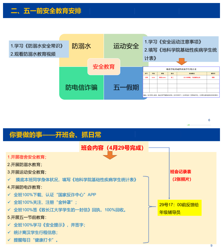 根据会议要求安排,公司所有班级已于4月26日—29日召开五一假期安全教育主题班会,全院员工100%下载实名注册“国家反诈中心”APP、100%关注实名注册“金钟罩”公众号、100%签署防诈“致太阳成tyc33455ccwww员工的一封信”回执、100%报备假期离汉行程、100%签署五一假期安全告知书。