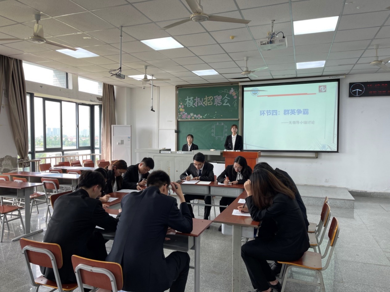 晋级本次大赛的18位优秀选手依次进行情景面试,选手根据自身优势开展自我介绍,需要在有限的时间内将自己的优势和特长展示出来;在应对评委的提问环节,选手们逻辑清晰、目标明确、一一作答。之后,第一轮得分位于前十名的同学进入无领导小组讨论环节。
