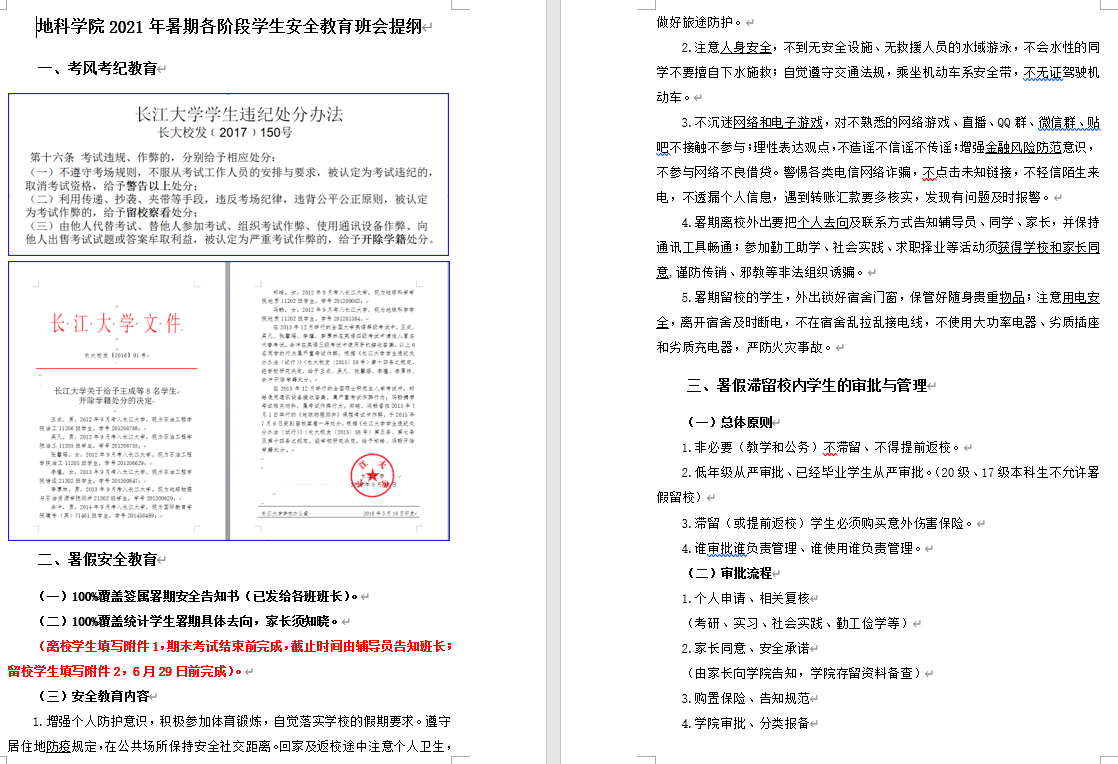 6月23日,学工办全体老师集中对暑期各阶段员工安全教育工作的方方面面进行了梳理,就重难点工作进行了具体安排与分工,并拟定《2021年暑期各阶段员工安全教育班会提纲》进一步保证班会效果。6月24日,各辅导员分年级组织召开了班长及安全员会议,重点讲解了安全教育班会的内容,并对如何开好班会及各类资料的收集进行了一一说明。