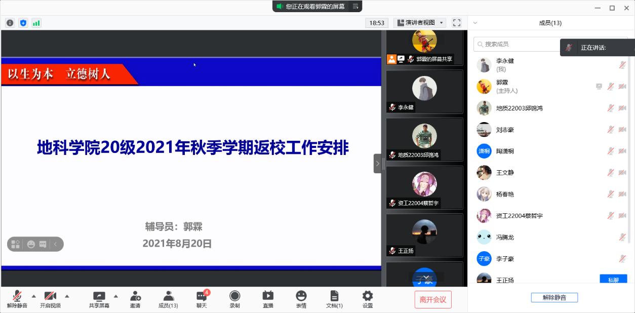 (通讯员 李永健)为确保2021年秋季学期开学返校工作平稳有序开展,公司按照疫情防控要求以及8月15日公司发布的《关于做好2021年秋季学期开学准备工作的通知》,于8月20-22日用腾讯会议的形式在全体员工中召开了“2021年秋季学期返校工作安排”主题班会。