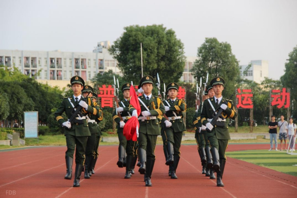威武庄严的国旗护卫队精神抖擞、身姿挺拔,迈着铿锵有力、整齐划一的步伐行进至升旗台下。