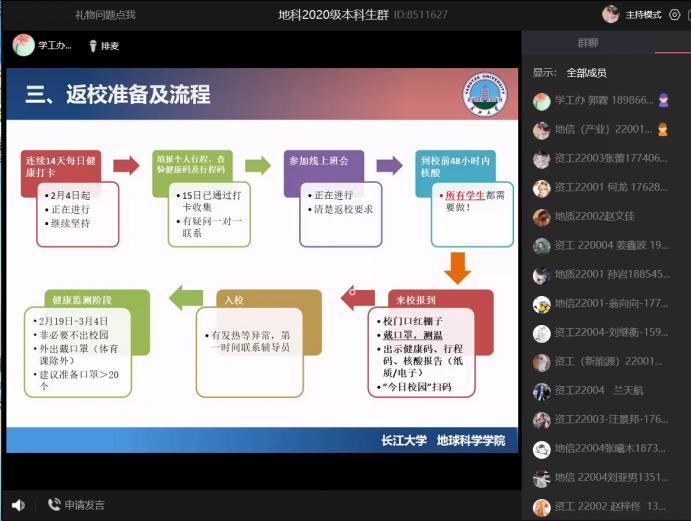 主题班会从返校时间安排、不能返校的几种情况、返校流程、春季学期重点工作、防电诈等方面展开。首先,辅导员老师为同学们讲解了返校及开学的时间安排,并强调不能擅自提前返校,对因处在中高风险地区、行程码带星号以及特殊原因延迟返校的同学需要办理的手续进行了规定与解答,然后对返校流程的7步骤逐一进行了讲解,特别是对“填报个人行程、查验健康码及行程码”、“准备到校前48小时内核酸报告”、到校报到等重难点进行了耐心的解释说明,并提醒同学们做好返校旅途的个人防护。随后,21、20级将开学补考、19和20级将就业及考研工作,分别作为春季学期重点工作进行了强调与动员,并告诫同学们要捂好自己的钱袋子,谨防电信诈骗。最后,辅导员老师对大家的疑问一一进行了解答,并提醒同学们旅途做好防护。