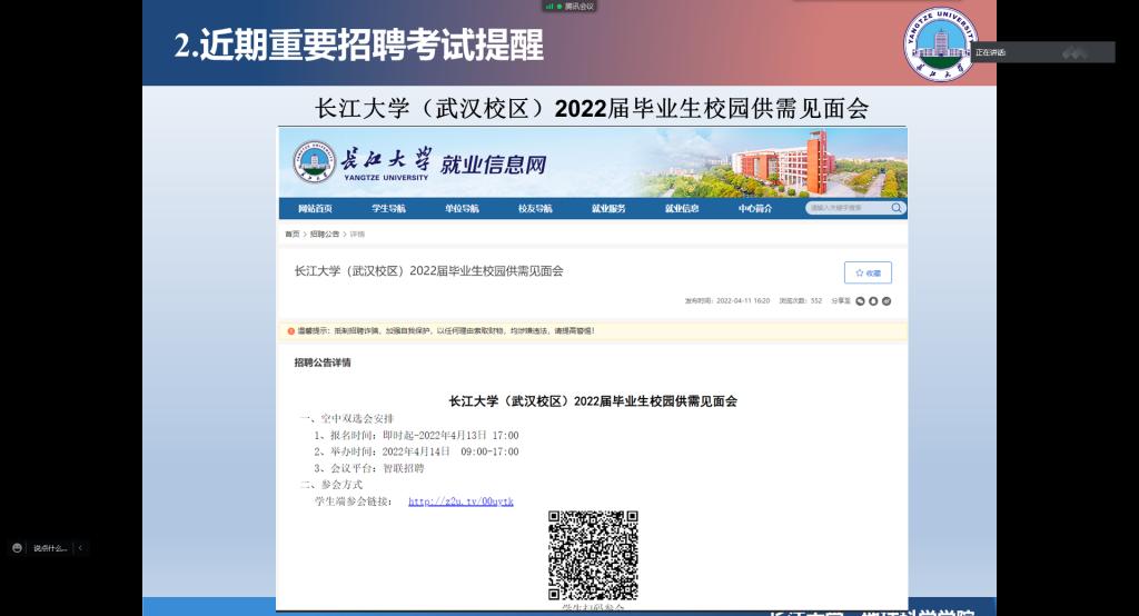 会上,张老师从签约注意事项、近期重要招考信息、毕业生调档等方面为同学们做了解答。在签约过程中要注意细节,保障自己的权益,签约结束后一定要按照甲方要求提交纸质协议;当前,正值春招旺季,如武汉校区2022届毕业生校园供需见面会、中国石油2022年高校毕业生春季招聘、湖北省省直事业单位2022年统一公开招聘等校园供需见面会、国企和事业单位招考也正在进行中,希望同学们抓紧时间,把握机会;最后在毕业生调档答疑方面,他从政策、往届同学们的种种经验等方面做了详细解答。
