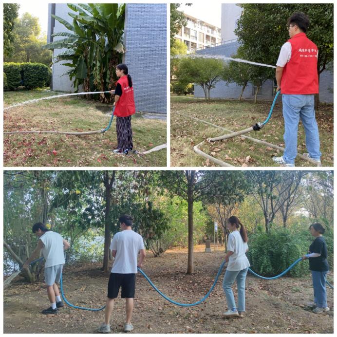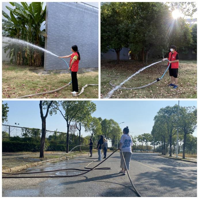 同学们3—4人为一组,跟随后勤工作人员,来到负责区域,进行绿化带浇灌。面对绿化带面积大、浇水水管重、水流冲击力强等困难,同学们热情高涨,毫不畏惧。伴着知音湖畔清爽的秋风,同学们充分发扬不怕脏、不怕苦、不怕累的精神,分工合作、有序推进,用手中的水管仔仔细细地浇灌每一片区域、每一棵植物,他们的身影是校园内一道靓丽的风景线。在全体成员的不懈努力之下,绿化带中的树木除去了杂尘,喝饱了水分,重新焕发盎然生机。